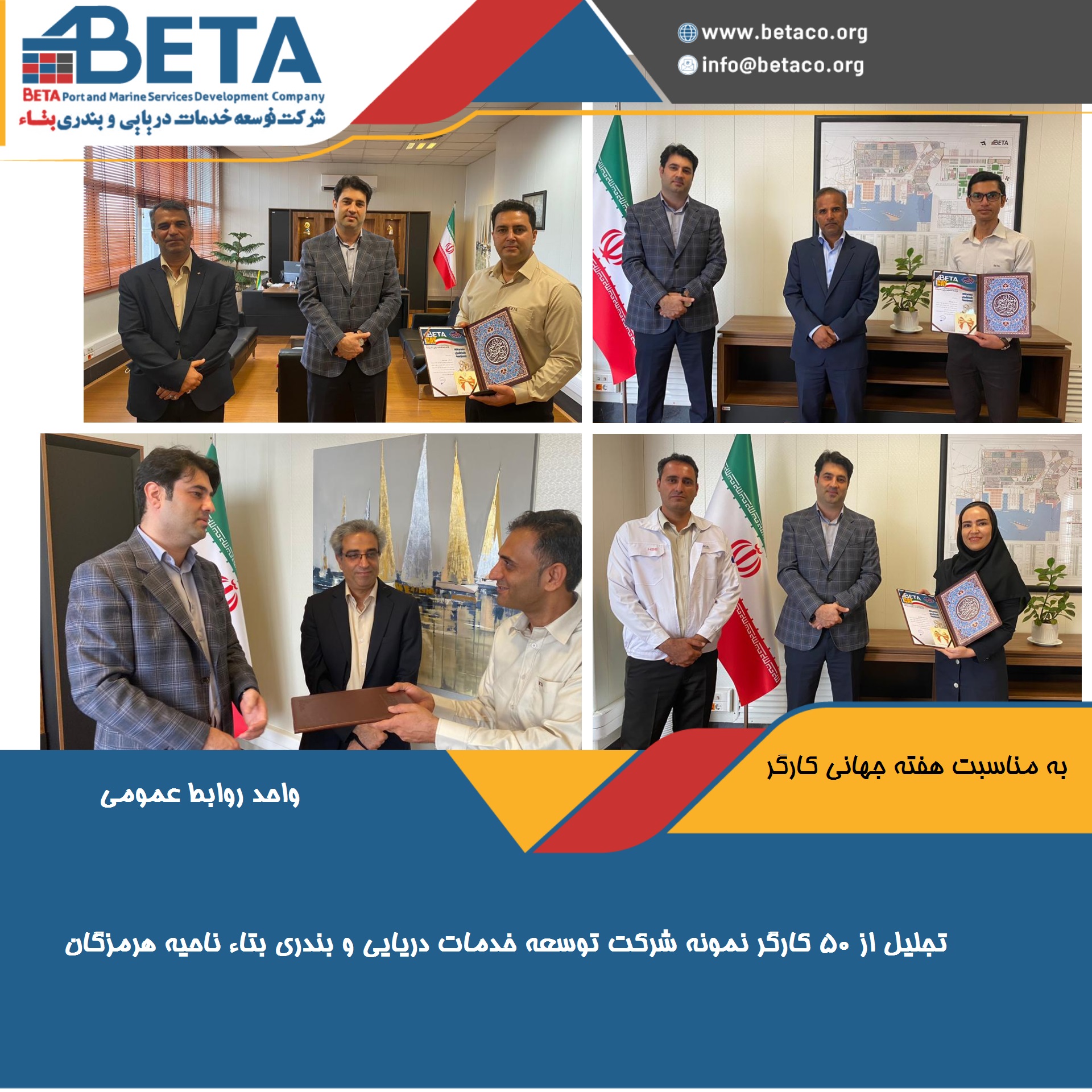 وی ضمن آرزوی موفقیت برای کارگران نمونه در سال پیش رو افزود: همه ما به معنای واقعی کلمه کارگر هستیم و همه کارکنان شرکت بتاء با جان و دل برای رونق اقتصاد کشور عزیزمان ایران و تحقق اهداف شرکت و سازمان بنادر و دریانوردی تلاش می کنند.