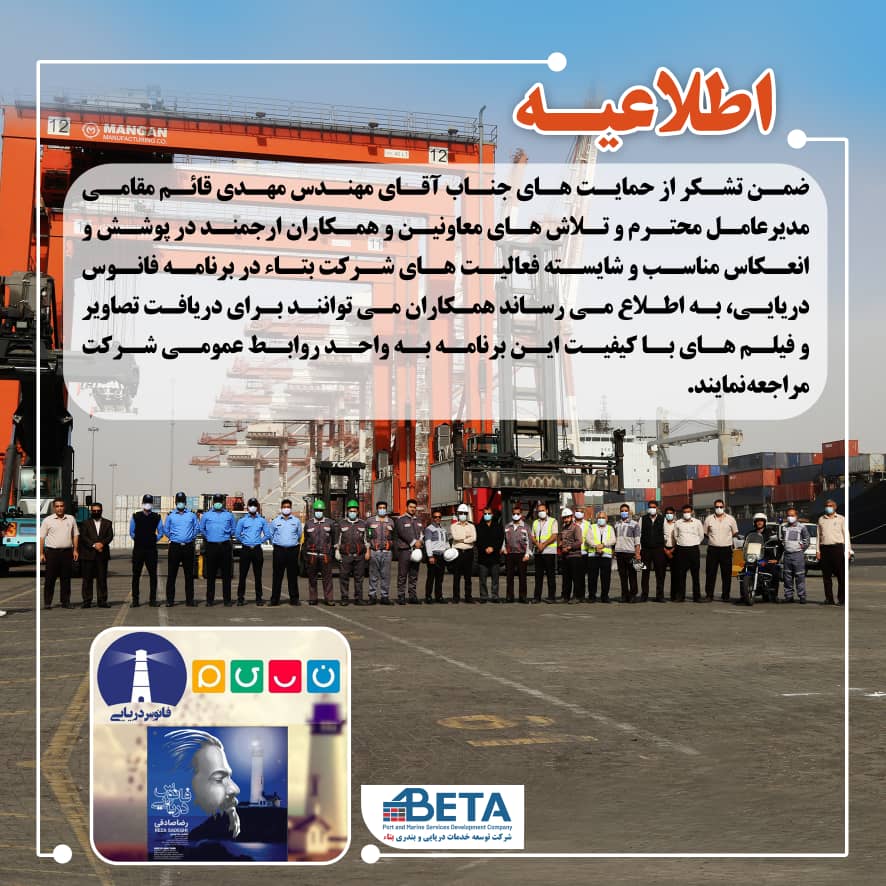 فعالیت مختلف شركت بتاء در بندر شهید رجایی که بخش های مختلفی از آن مربوط به فعالیت های همکاران در بخش هاي عملياتي، فني مهندسي و ايمني بهداشت بود، طي اين برنامه ها به نمایش گذاشته شد.
