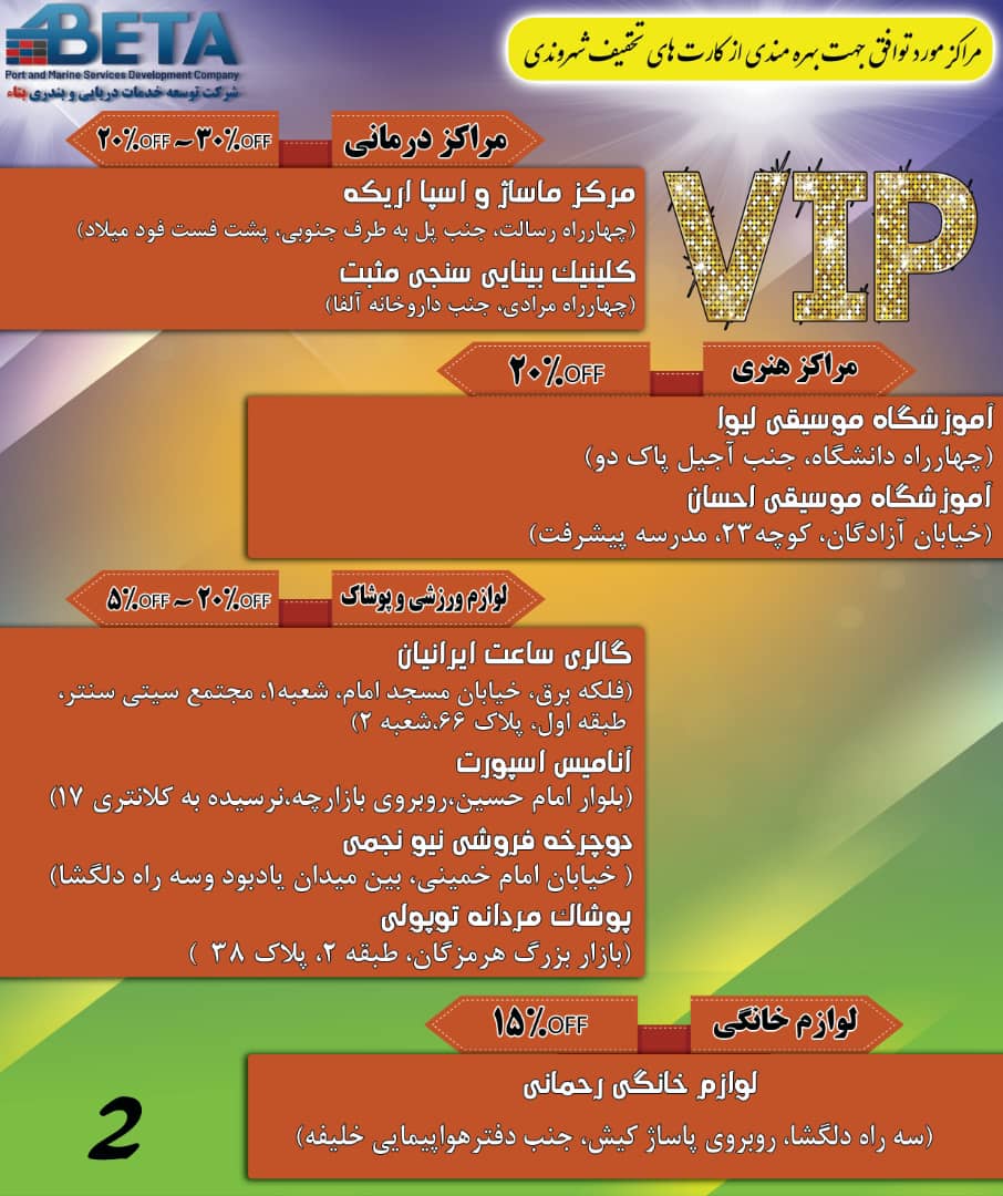بر اساس توافق به عمل آمده با مجموعه های تفریحی، ورزشی، مراکز خرید و درمانی سطح شهر بندرعباس ، کارکنان شرکت بتاء می توانند با ارائه کارت تخفیف از کسر هزینه های پرداختی استفاده نمایند.