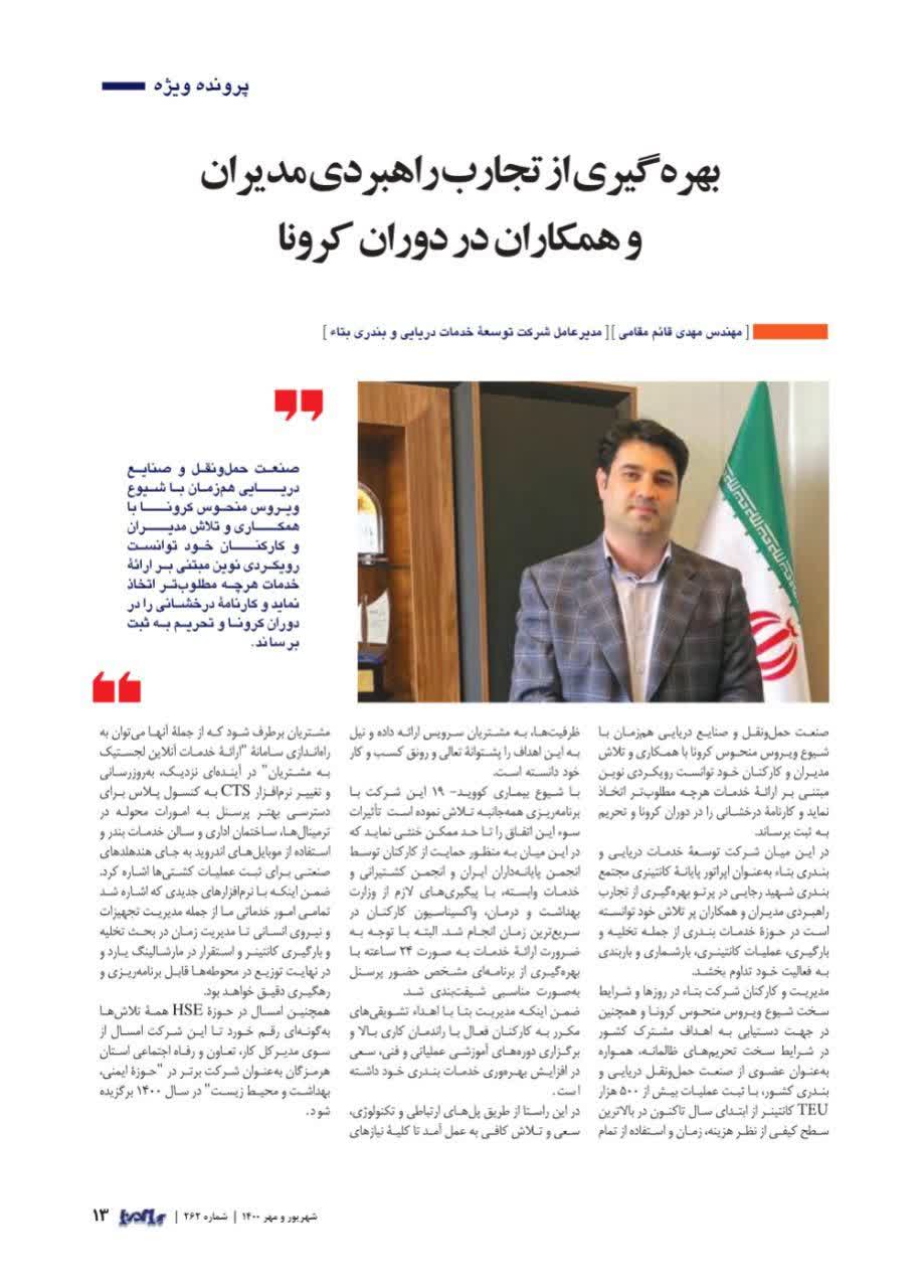 با نشریه پیام دریا از انتشارات روابط عمومی کشتیرانی جمهوری اسلامی ایران با عنوان '' تحریم و کرونا حریف حمل و نقل دریایی ایران نشد''