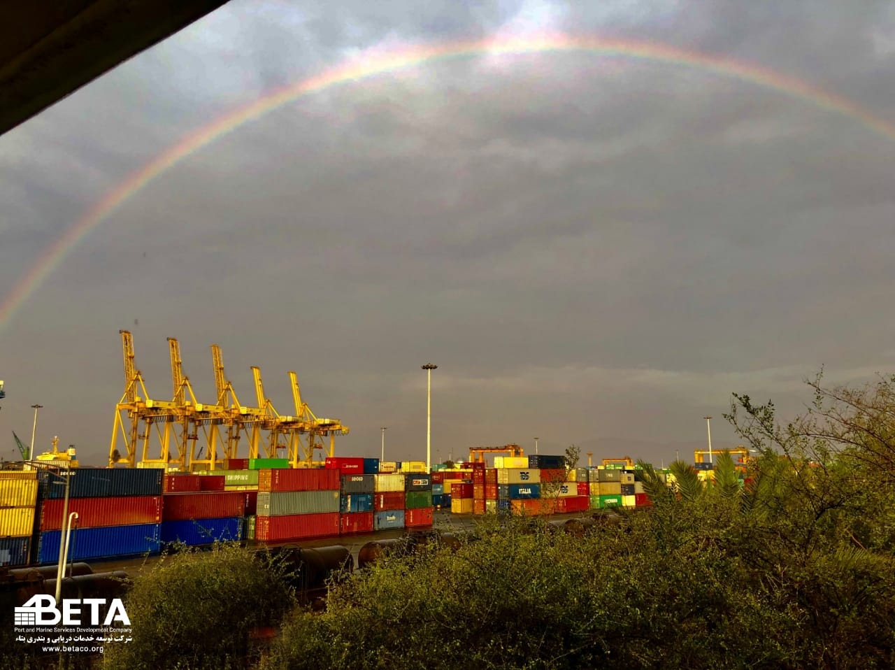 نمایی زیبا از تشکیل رنگین کمان ترمینال کانتینری شماره یک شرکت بتاء پس از بارندگی امروز