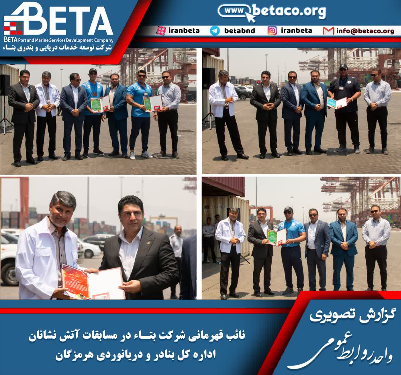 به گزارش واحد روابط عمومی شرکت بتاء، مسابقات عملیاتی ورزشی آتش نشانان بنادر اداره کل بنادر و دریانوردی استان هرمزگان با حضور تیمهایی منتخب بنادر کشور، اداره کل بنادر و دریانوردی استان هرمزگان، شرکت های توسعه خدمات دریایی و بندری بتاء، سینا، افق چکاد دریا، مهندسی کشتیرانی قشم، سی دلف نفتی و بناگستر کرانه به مدت یک روز به میزبانی ترمینال دو شرکت بتاء در بندر شهید رجایی برگزار شد.