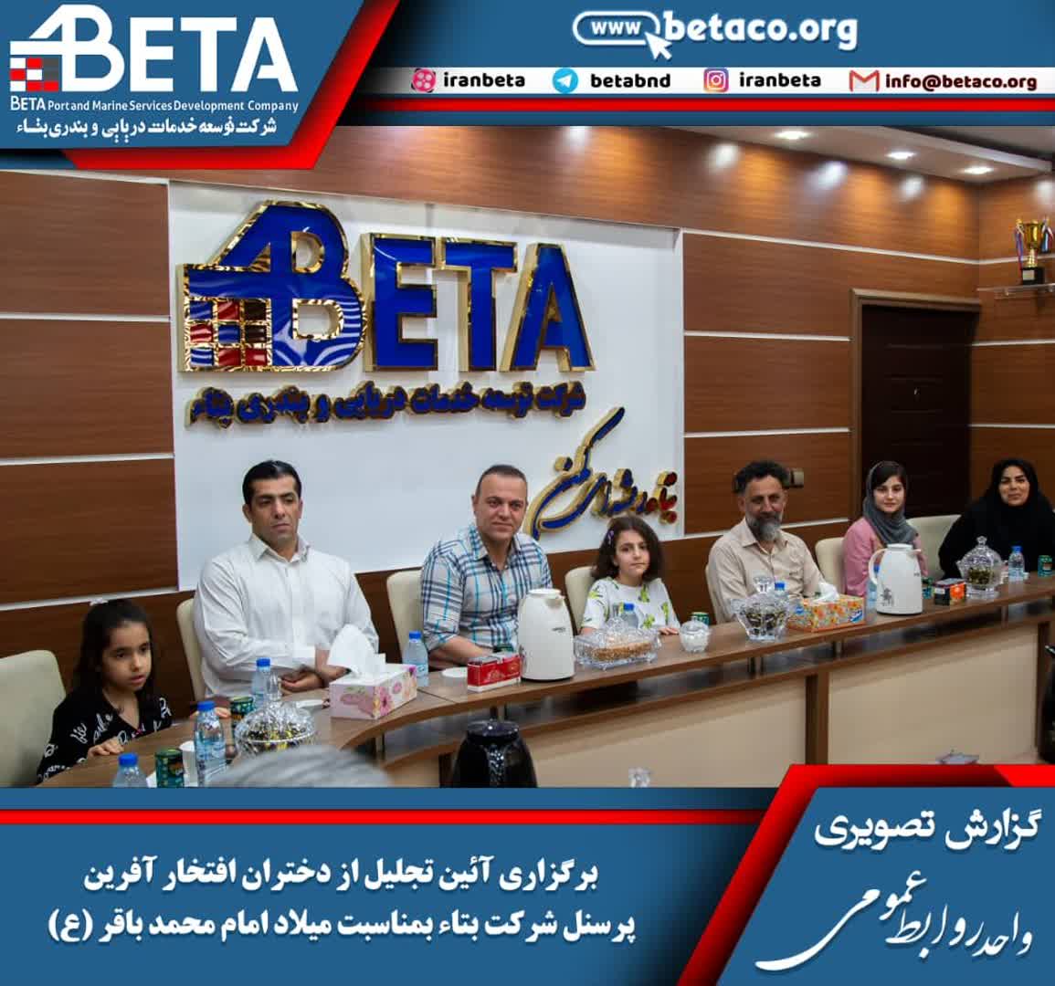 مدیرعامل شرکت توسعه خدمات دریایی و بندری بتاء در ابتدای این مراسم ضمن عرض تبریک به فرزندان دختر، برای آنان در ادامه مسیر زندگی در کنار خانوده معظم شان، آرزوی کسب موفقیت ها و دستاوردهای بزرگتر نمود و گفت: می بایست با حضور فرزندان کارکنان در محیط کاری بندر، آنان را شغل پدرهایشان آشنا کرد و بدینوسیله زمینه ارتقاء سطح دانش فرزندان خانواده بزرگ شرکت بتاء را فراهم آورد.