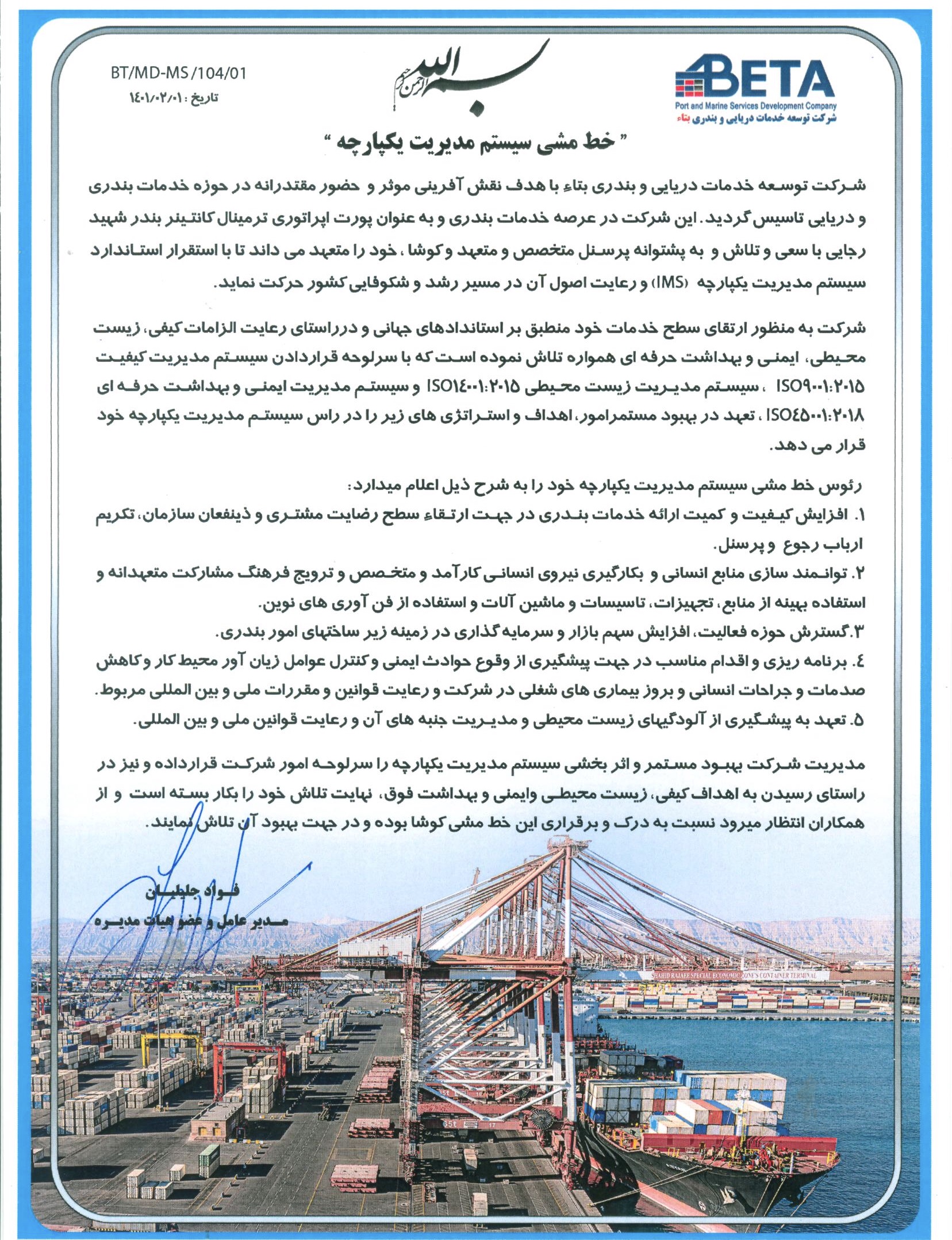 شرکت توسعه خدمات دریایی و بندری بتاء با هدف نقش آفرینی موثر و حضور مقتدرانه در حوزه خدمات بندری و دریایی تاسیس گردید. این شرکت در عرصه خدمات پورت اپراتوری با سعی و تلاش و به پشتوانه پرسنل متخصص و متعهد و کوشا، خود را متعهد می داند تا با استقرار استاندارد سیستم مدیریت یکپارچه (IMS) و رعایت اصول آن در مسیر رشد و شکوفایی کشور حرکت نماید. شرکت به منظور ارتقای سطح خدمات خود منطبق بر استاندادهای جهانی ودرراستای رعایت الزامات کیفی، زیست محیطی ، ایمنی و بهداشت حرفه ای همواره تلاش نموده است و با سرلوحه قراردادن سیستم مدیریت کیفیت ISO9001:2015 ، سیستم مدیریت زیست محیطی ISO14001:2015 و سیستم مدیریت ایمنی و بهداشت حرفه ای ISO45001:2018 ، تعهد در بهبود مستمر امور، اهداف و استراتژی هایی را در راس سیستم مدیریت یکپارچه خود قرار داه است.