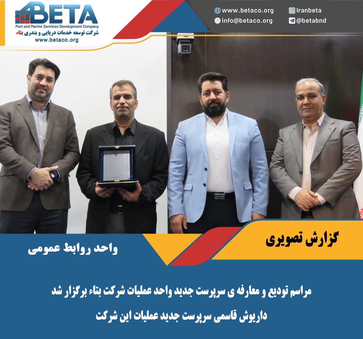 به گزارش واحد روابط عمومی شرکت بتاء، با حضور آقای مهدی قائم مقامی مدیرعامل شرکت توسعه خدمات دریایی و بندری بتاء و معاونین شرکت، از خدمات صادقانه آقای امیر داتام تاریک تقدیر و آقای داریوش قاسمی به عنوان سرپرست واحد عملیات شرکت بتاء معرفی شد.